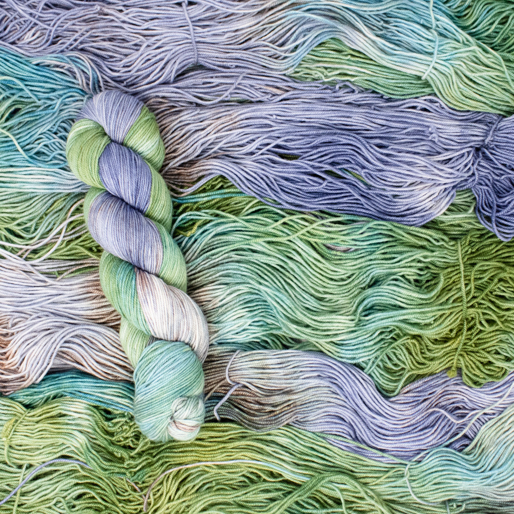 Inspired by the rarely glimpsed frost covered desert, the handpainted skein mixes cactus green, blued steel, and desert sand tones together creating a verdant oasis.