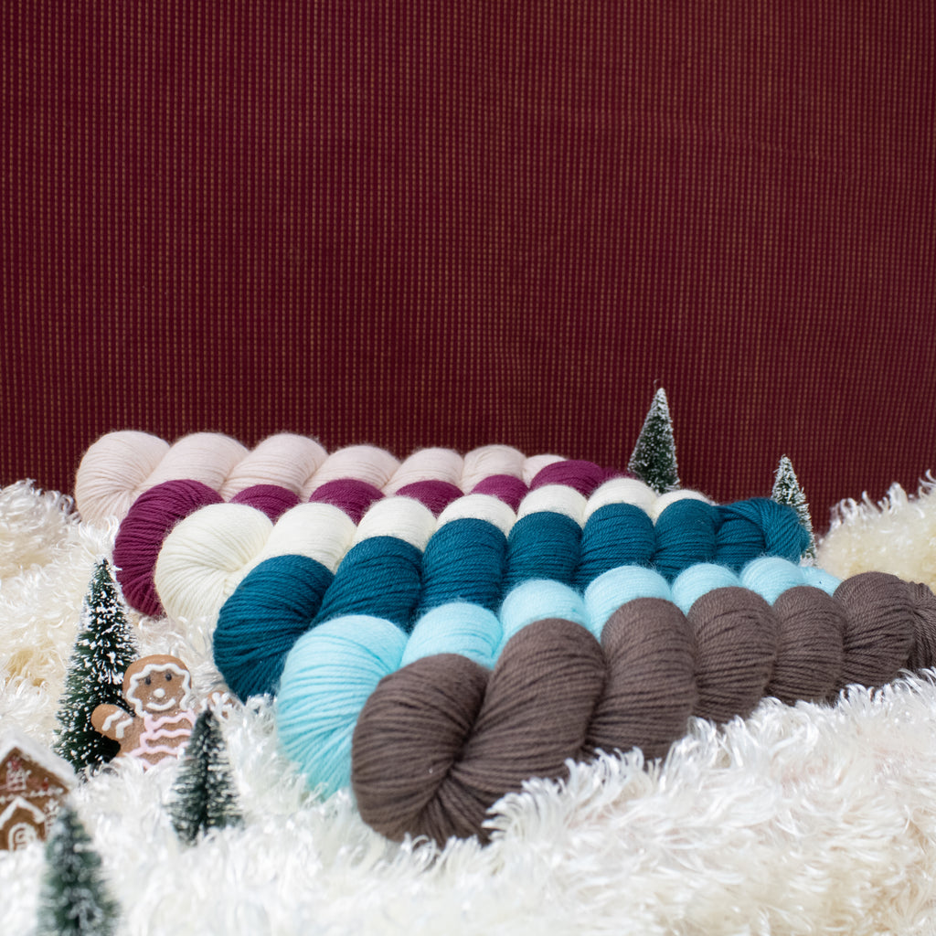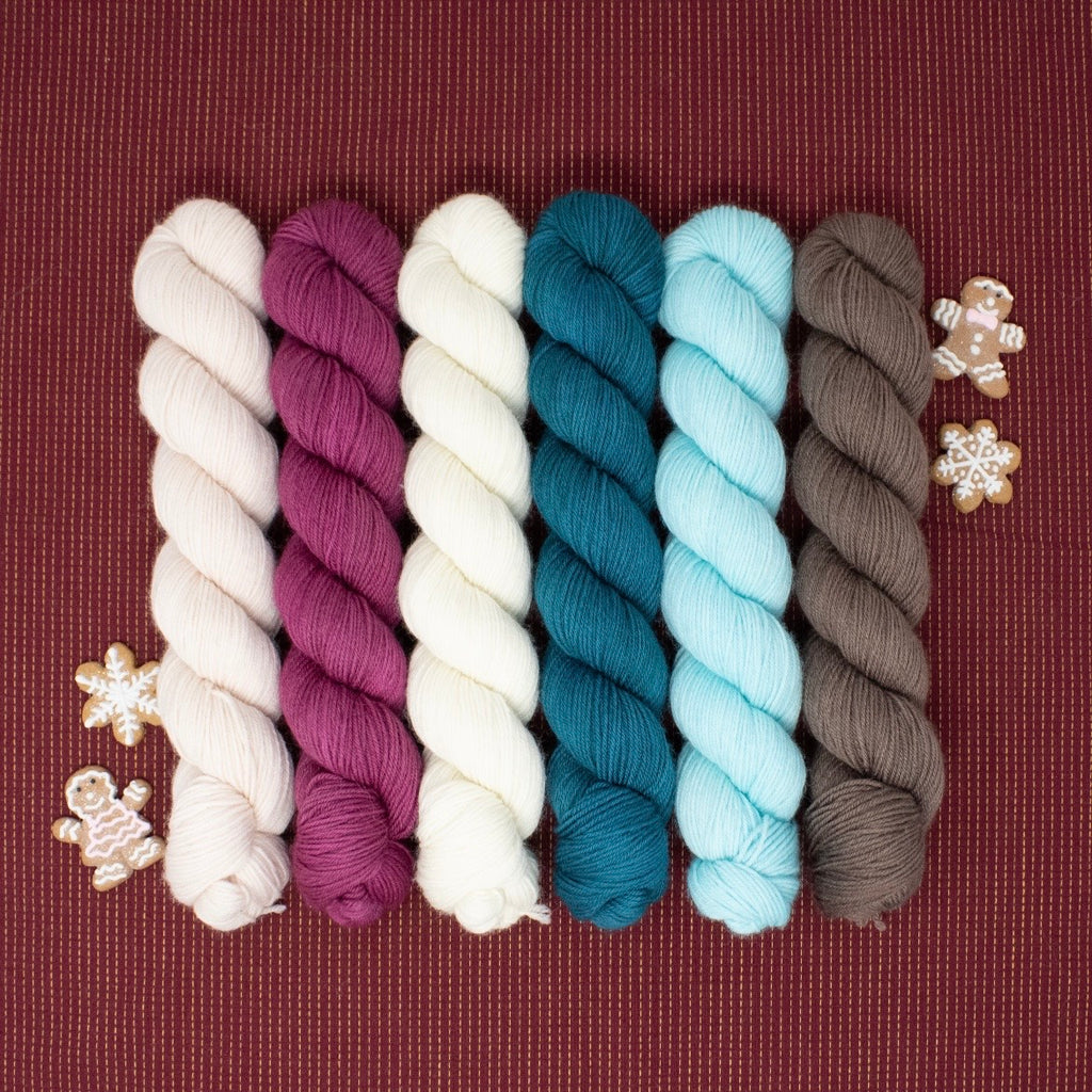 Each Kit is a delicious lineup of 6 (50g) skeins of NoDa Sock (Sandy Claws, Jelly of the Month Club, Royal Icing, Son of a Nutcracker, Triple Dog Dare You, and World’s Best Cup of Coffee), hand-dyed with our signature Queen City flair. Perfect for your festive fiber cravings!