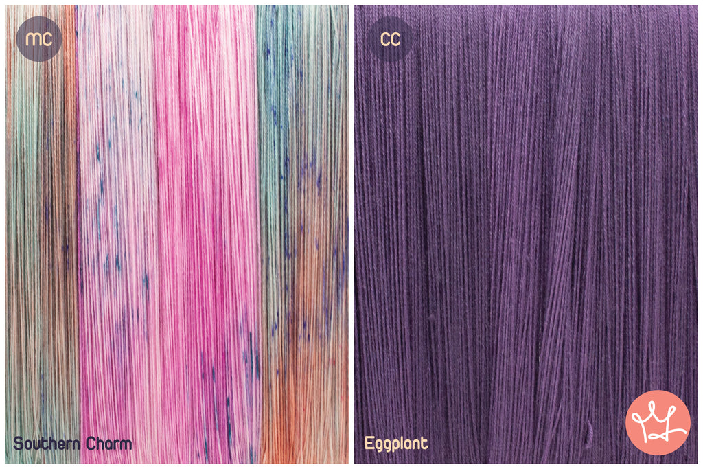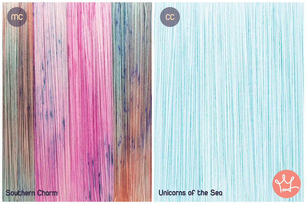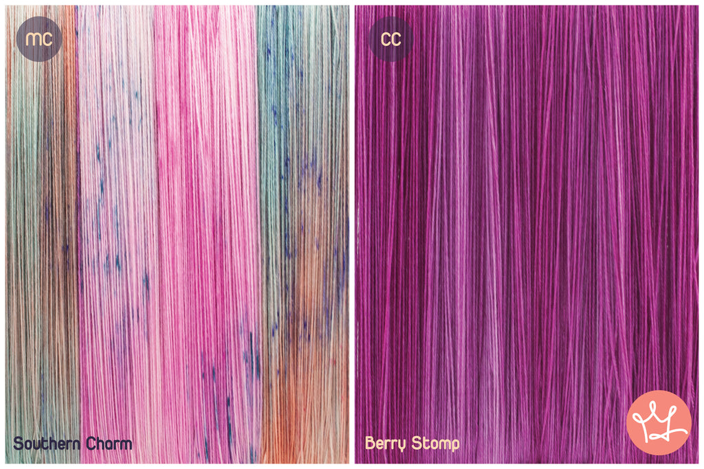 This colorway was the beginning of a new dye technique we call watercolor. It features washes of Bless Her Heart, Berry Stomp, and mint and speckles of grey and blue.