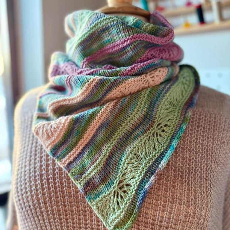 The knit version, Desert Frost, is a bandana style cowl. Rippling stitches and delicate lace motifs echo windswept sand, frost-kissed plants, and the quiet resilience of winter in the desert.