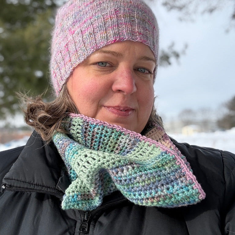 The crochet version, Desert Glow, is a beginner-friendly crochet cowl. Worked flat and joined at the end, this pattern uses simple single and double crochet stitches to create an easy, rhythmic fabric that’s relaxing to make and comfortable to wear.